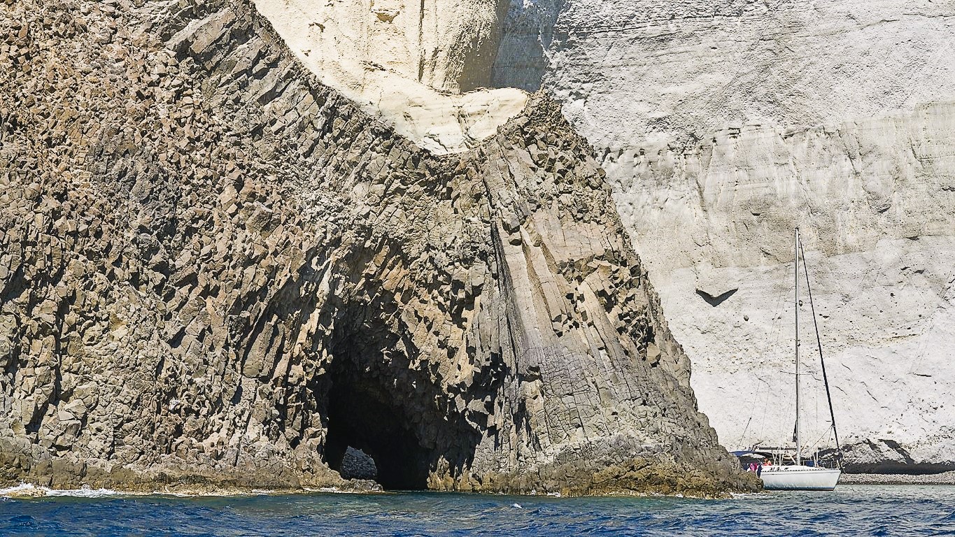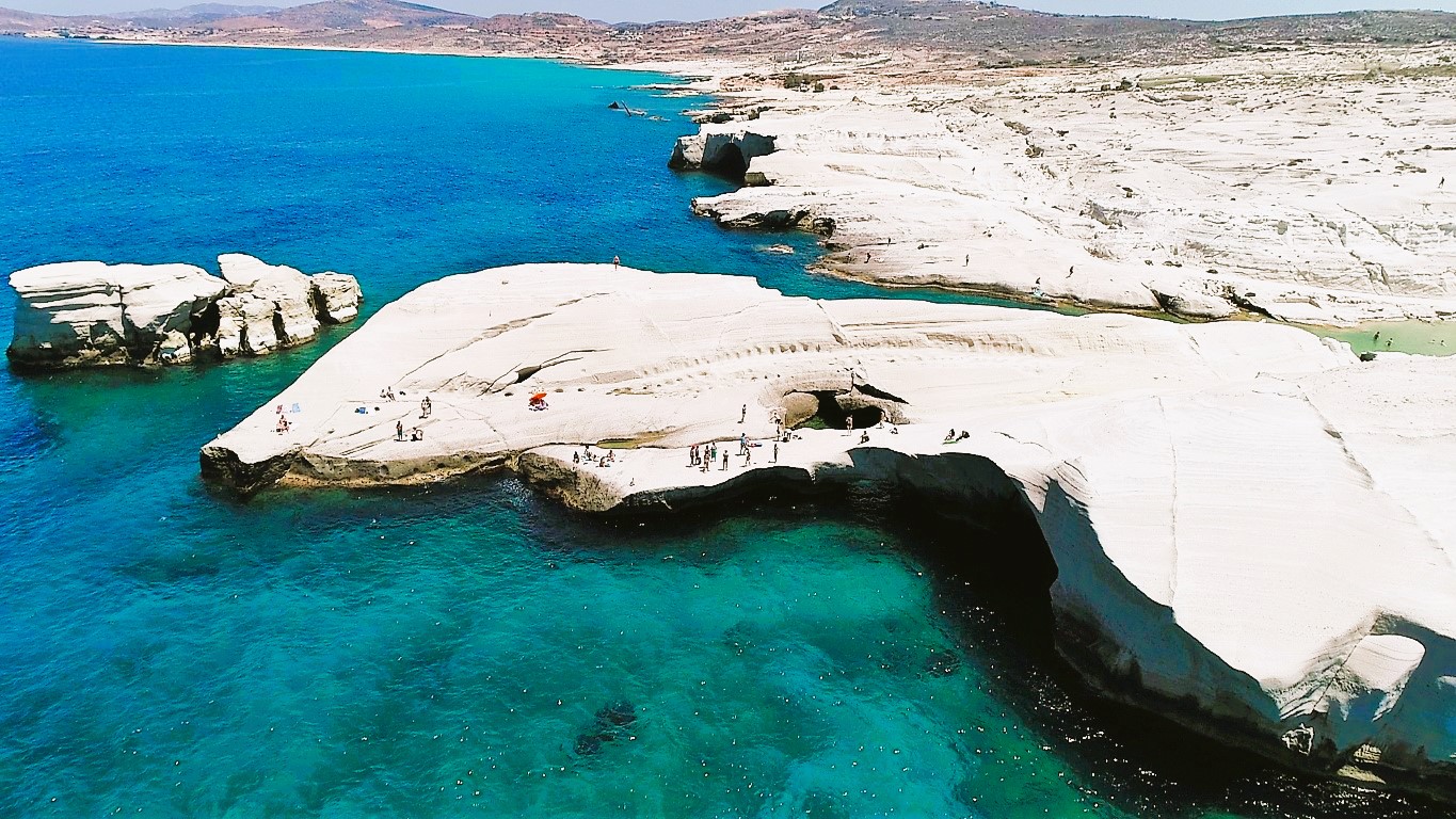 We continue north, passing the large entrance of Adamas port of Milos and head northeast to our next stop, the magnificent Sarakiniko beach, one of the most photographed landscapes in Milos and the Cyclades. We spend about an hour swimming in deep waters, jumping and diving off the tall, grayish-white cliffs with unique shapes often compared to a moon’s surface.