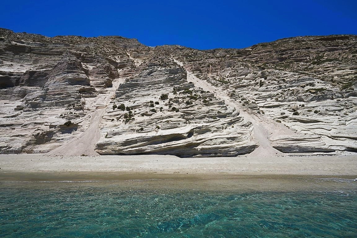 We set sail from Pollonia and after a 5.5 nautical mile journey that takes less than 15 minutes, we reach the renowned sulfur mines. We drop anchor and can swim to the beach where we can visit an old mine that was in operation until the mid-1950s. It is a breathtaking location that resembles a scene from a Sergio Leone western movie. The sea water is yellow due to the sulfur, and it’s said to have therapeutic properties. We can visit the old factory where the old machinery is still present. We spend about 20 minutes there.